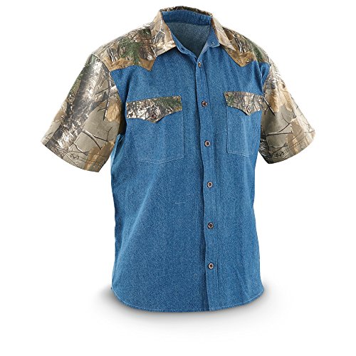 Guide Gear Short-sleeved Denim Shirt with Camo Accents looks pretty snazzy. Yeah, we’ll admit it. This is a darn good-looking Shirt. Its cotton Denim is not too light and not too heavy, in a sharp blue color that goes with pretty much everything. Then we added Realtree® camo accents in just the right places. So if wearing camo is too casual for work or play, this button-front Shirt is a perfect alternative to show off your hunter’s passion. Get ready for compliments: 100% cotton; 2 front chest pockets; Realtree camo accents on collar, yokes, flaps and sleeves; Machine wash / dry; Imported. State Size. Guide Gear Short-sleeved Denim Shirt, Stonewash